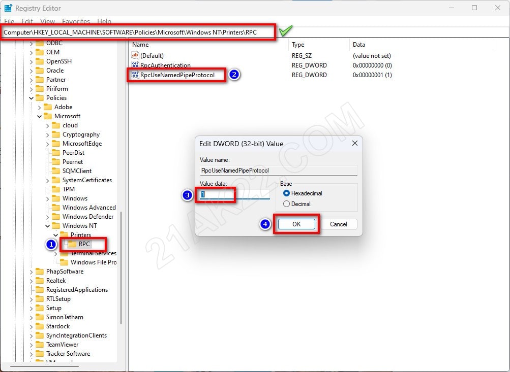 Mở theo đường dẫn Computer\HKEY_LOCAL_MACHINE\SOFTWARE\Policies\Microsoft\Windows NT\Printers\RPC , rồi nhấn dúp vào RpcUseNamedPipeProtocol, ở Value data điền số 1, nhấn OK là xong.